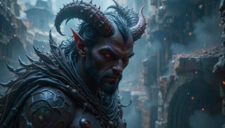 Close-up of a formidable figure, likely a fantasy character, with horns, armor, and a determined expression. The background hints at a gothic or medieval-style setting.