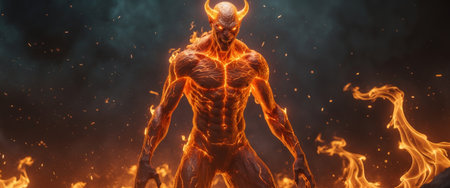 AI Generated. Molten demon figure with glowing orange eyes and fiery body standing in a hellish inferno surrounded by flame and intense burning heat