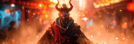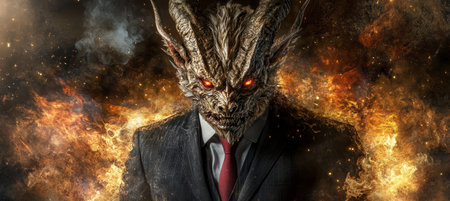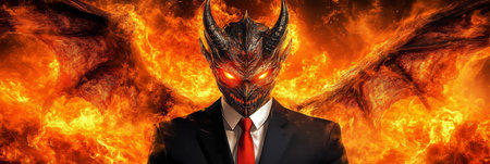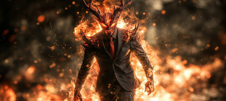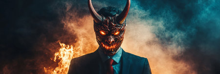 Fiery Businessman in Devil Mask with Horns, Smoke, and Embers, Dramatic Lighting, Intense Colors