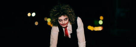 Creepy Clown Man in Vest and Red Tie Gesturing at Night Outdoors