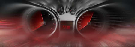 A powerful car's headlights pierce through an atmospheric haze of red and blue neon smoke, reflecting vibrantly on wet pavement, creating a dramatic and energetic scene.