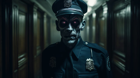 a policeman stands in a hallway, donning dark and spooky-themed makeup. his detailed facial features are accentuated, creating an otherworldly grotesque appearance. the photo, captured with provia, showcases whiplash lines and a celestialpunk vibe. the crimson hues add to the eerie atmosphere. ai generated