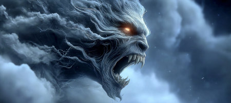 Fearsome Visage A Terrifying Beast Emerges from Ominous Clouds, Filled with Darkness and Horror