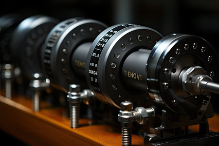 A detailed close-up of a sophisticated machine part showcasing precision engineering within a modern manufacturing facility. The image highlights the intricate details and advanced technology involved in industrial production processes.