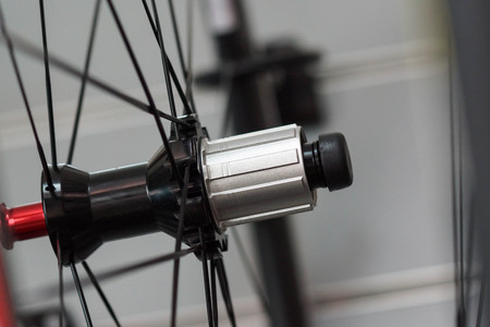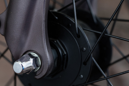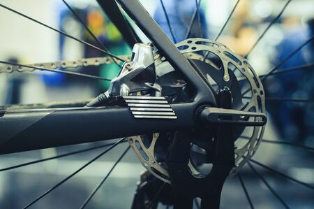 Mountain bike wheel with disc brake close up. Repair service and sale of spare parts