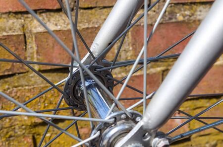 Bicycle wheel against a dirty wall in the garage (Pesaro, Italy, Europe)