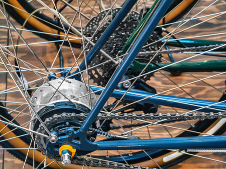 Detailed view of bicycle components highlighting gears and wheels in a close-up shot indoors