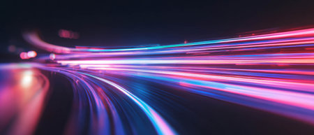 This captivating image features vibrant light trails against a dark background, creating an abstract representation of motion and speed. Ideal for conveying energy and modernity.