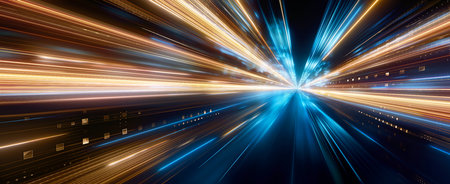 This digital illustration presents vibrant light trails in blue and orange hues, creating an abstract and dynamic visual. The composition features linear streaks of light converging towards a central point against a dark background. This image could be suitable for various commercial purposes, including website backgrounds and marketing materials.