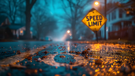 Rain-soaked street at twilight with a glowing Speed Limit sign, reflecting lights, and a mysterious ambiance.