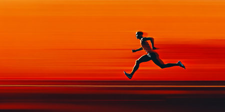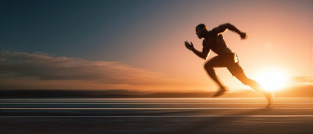 A man is running on a road, captured with motion blur, suggesting speed and action. The image showcases vibrant colors of a sunset with a clear sky. The style is dynamic, with implied movement and horizontal composition. The scene could be used for athletic, fitness, or motivational content.
