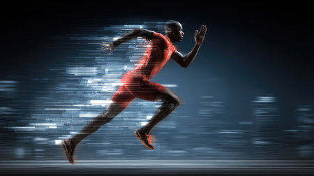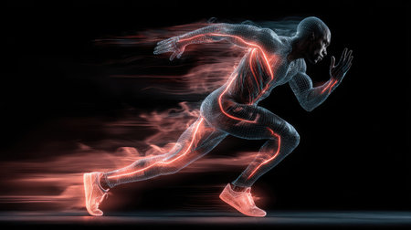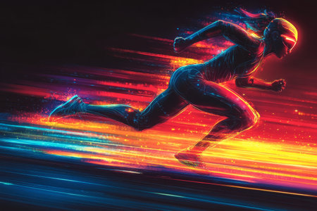 An athlete depicted in a vibrant motion with glowing effects, showcasing the essence of speed and energy against a dark backdrop, symbolizing performance and innovation.