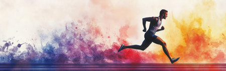 A focused runner dashes forward with determination against a backdrop of colorful watercolor splashes, capturing the vibrant energy of a dynamic athletic competition at dusk.