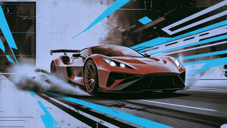 This captivating image features a racing car in motion, illuminated by dynamic light trails, capturing the essence of speed and energy in a modern design.