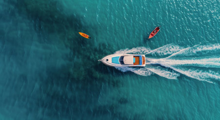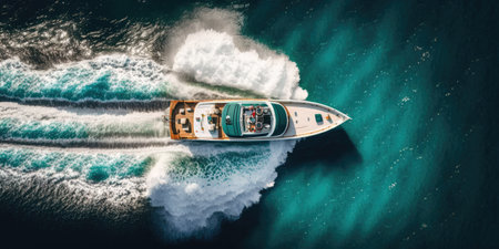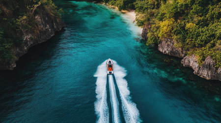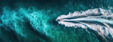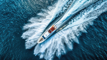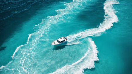 Aerial view of a fast boat creating dynamic waves in crystal blue ocean water. Perfect for conveying adventure and summer leisure activities.