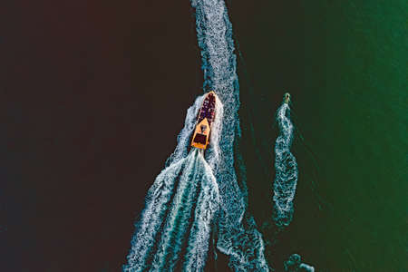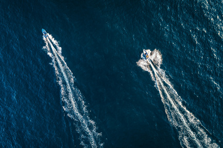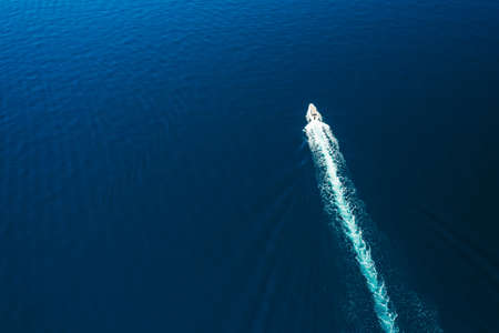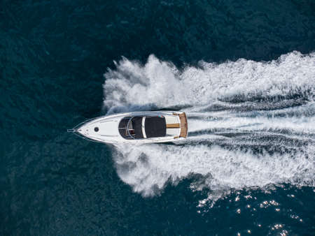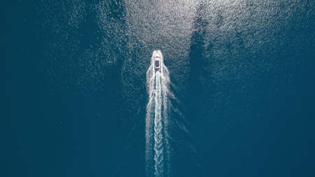Aerial top down view of speed motor boat on open sea at summer day