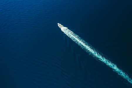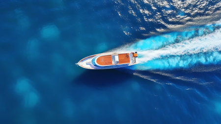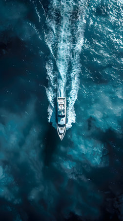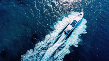 An aerial view showcases a motorboat traversing deep blue ocean waters, leaving a striking white wake. The composition highlights the contrast between the boat and the water, with the wake's texture standing out. This imagery suggests concepts like travel or transportation, suitable for various commercial or editorial uses.