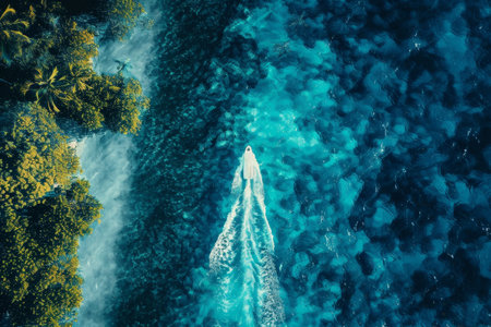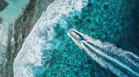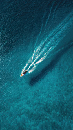 An aerial perspective showcases a boat speeding through turquoise water, leaving foamy white trails. The composition features contrasting colors and textures, capturing the motion and energy of the vessel. This image is suitable for various commercial uses, including advertising, travel, and environmental themes.