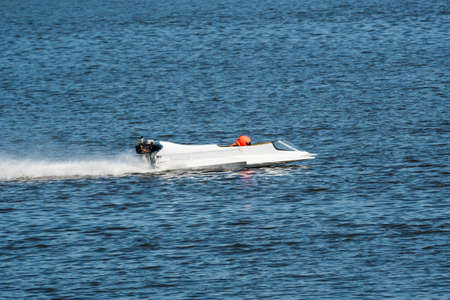 White powerboat go fast along the blue water at powerboat racing