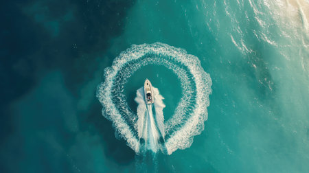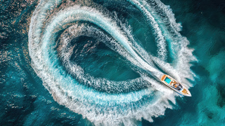 An aerial perspective shows a powerboat creating stunning circular water patterns in the ocean, highlighting the beauty of marine adventures and outdoor leisure.