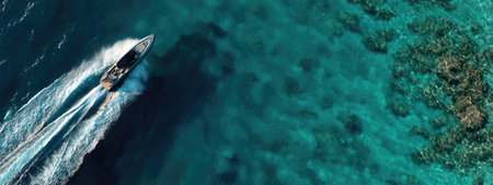 Experience the thrill of adventure with this aerial view of a speedboat gliding through crystal-clear turquoise waters, revealing a vibrant coral reef below.