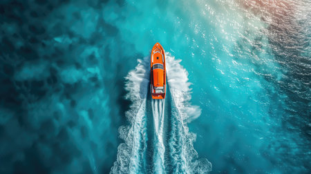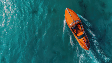 High-performance motor boat cutting through dark waters. Captured from a top view, with vibrant orange seats powerful movement and design for promoting water travel.