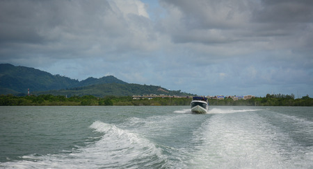 Engines of speed boat are driving along waving of water on ocean with mountain and cloudy sky located south of Thailand