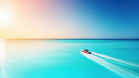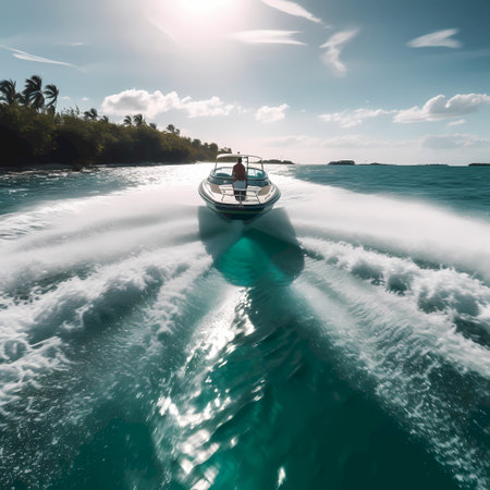 A sleek boat navigates the stunning turquoise ocean, leaving swirling white wake trails behind. The sunlight sparkles on the water's surface, creating a tranquil atmosphere.