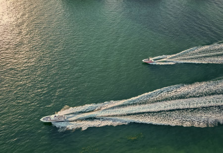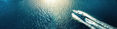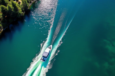 An overhead perspective reveals a white boat cutting through dark water, creating foamy wakes. The composition highlights the vessel's movement, with the sun casting highlights on the water. Suitable for illustrating travel, leisure, or transportation concepts, this image offers potential for diverse commercial applications.