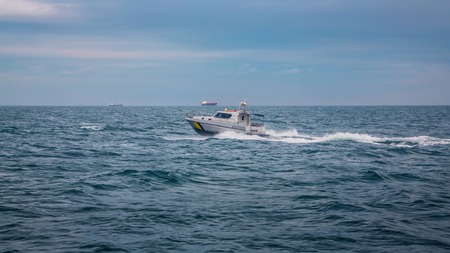 patrol boat on a mission in a harbor with industrial cranes and cargo ships in the background under a cloudy sky