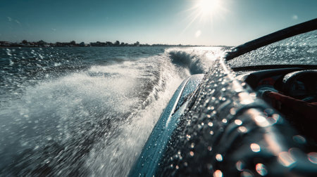 A dynamic view captures a speedboat cutting through water, sending splashes into the sunlight on a bright sunny day at the lake.
