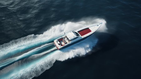 aerial view of a speed boat drifting in the water, showcasing a realistic and hyper-detailed rendering. captured using fujifilm eterna vivid 500t, the image highlights refined elegance with a combination of light indigo and red. the photo emphasizes exquisite craftsmanship, engineering construction, and design, all presented in stunning 8k resolution. ai generated