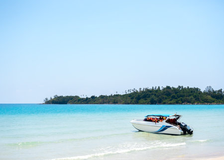 A travel speed boat with red life jacket vests on the shore near a white clean sandy beach on blue sea, green island and open sky background with copy space. Summer sea trip concept.
