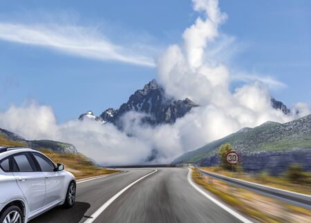 Highway among the mountain scenery. White car on a mountain road.