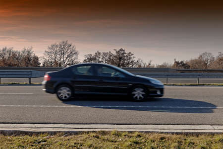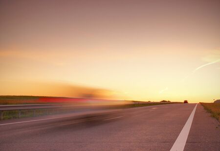 blurred car at high speed on the highway at sunset