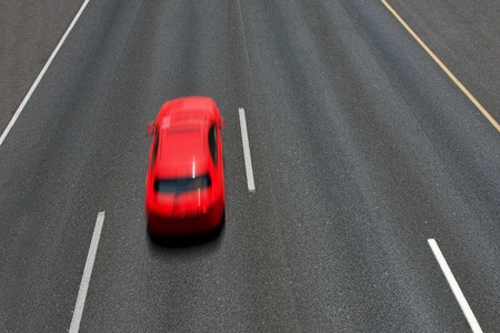 Red car moves fast on empty multilane highway (motion blurred).