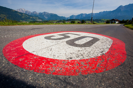 30km/h speed limit sign painted on asphalting road.