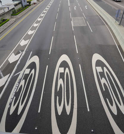 Two speed limit signs with 50 km per hour, painted on asphalting road. Panoramic banner view.