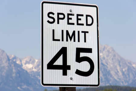 Traffic sign from United States with Speed Limit Forty five. Speed restriction shield in front of mountains of the Great Teton National Park in America.