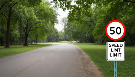 Speed limit sign with 50 in red circle against green forest background.