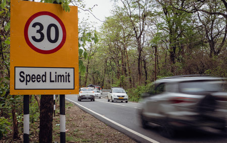 Aug2nd2024, Uttarakhand India. 30 km/h speed limit signboard alongside a road with a speeding vehicle in the midst of a forest in Uttarakhand, India.