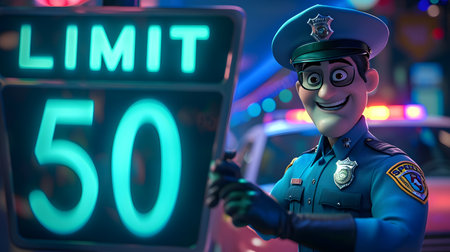Smiling animated police officer standing next to a 50 speed limit sign on a blue background.
