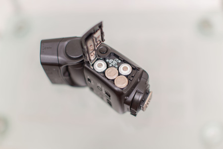 Black external flash for a camera with an open battery compartment
