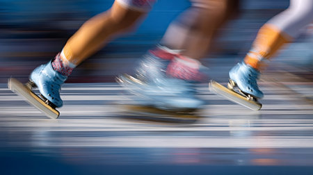 Athletes legs and speed skates moving rapidly across the ice surface during a race, capturing the dynamic action and speed of winter sports with strong motion blur