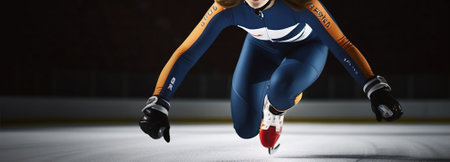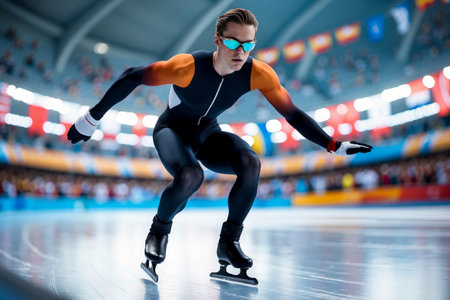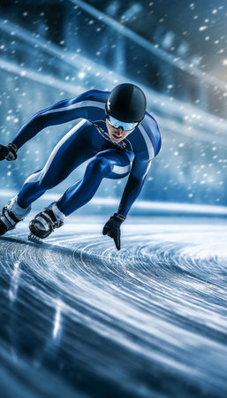 Dynamic speed skater navigating a sharp curve, displaying precision and athletic focus on ice