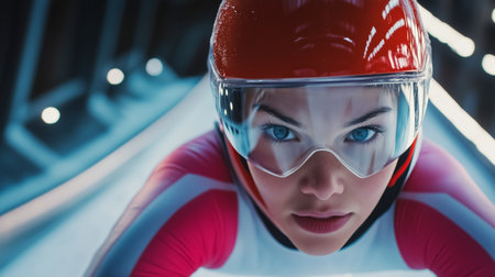 Female athlete in a speed skating helmet prepares for a run in a modern ice track during a winter sporting event