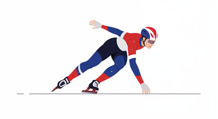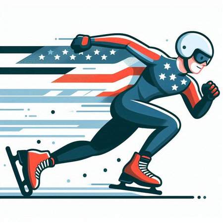 An energetic winter sports participant, dressed in a patriotic red, white, and blue racing outfit, maintains a low, aerodynamic stance while speed skating on a clear surface.