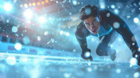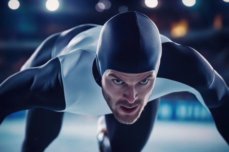 An athlete in a sleek outfit focuses intensely as he prepares to sprint on the ice during a competition.