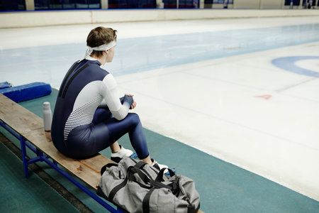 Rear view of young sportsman in speed skating uniform having rest while sitting on bench in front of spacious ice rink inside modern arena