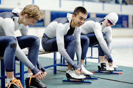 Side view of three professional short track speed skaters in sports uniform and protective eyeglasses standing on ice rink ready to start